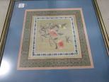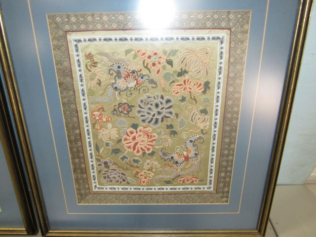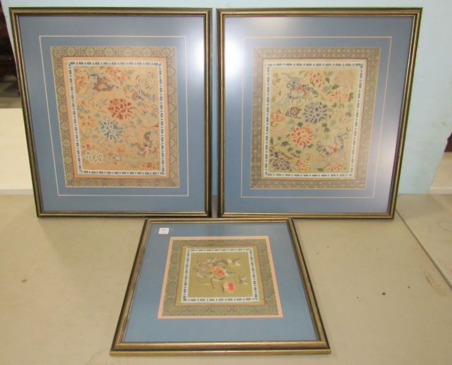 Two framed 21"h., 20"w. silk embroideries, one framed 16" x 16" silk embroidery. Two framed 21"h., 20"w. silk embroideries, one framed 16" x 16" silk embroidery.