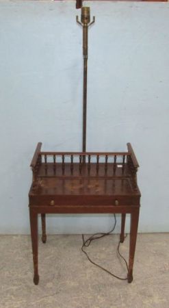 Divided gallery, one drawer, finish wear, legs have been chewed, brass lamp rod, 24"h., 18"w., 13"d. Divided gallery, one drawer, finish wear, legs have been chewed, brass lamp rod, 24"h., 18"w., 13"d.