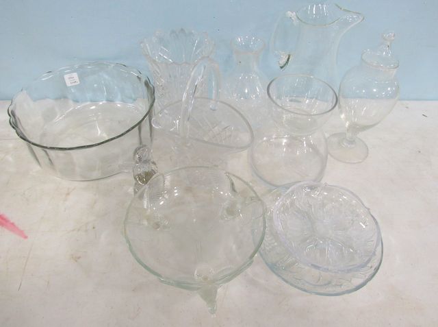 Glass basket, three vases, bowl 4"h., 10"dia., jar, bird bowl, divided serving dish, glass angel. Glass basket, three vases, bowl 4"h., 10"dia., jar, bird bowl, divided serving dish, glass angel.