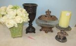 Resin Vase 14"h., Glass center piece compote, elephant resin candle holder, glazed pottery planter with artificial flowers Resin Vase 14"h., Glass center piece compote, elephant resin candle holder, glazed pottery planter with artificial flowers