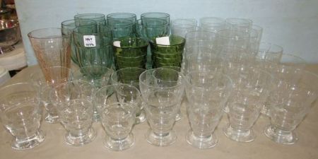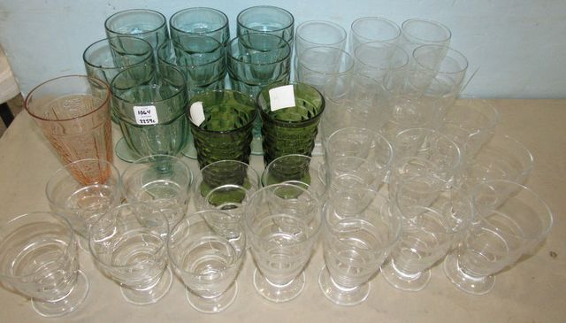 Twenty three clear glass matching cups, seven green goblets, two green whitehall cups, pink depression cup. Twenty three clear glass matching cups, seven green goblets, two green whitehall cups, pink depression cup.