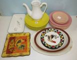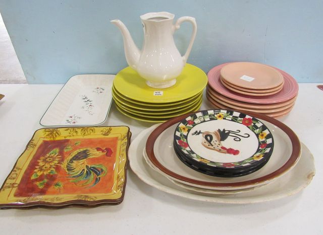 Fiesta dinner plates and saucers, six yellow dinner plates, three Home Accents roster plates, two orange rooster plates, Pfaltzgraff dish, Federalist ironstone pitcher, vintage Colonial platter 16"w., Shenango platter. Fiesta dinner plates and saucers, six yellow dinner plates, three Home Accents roster plates, two orange rooster plates, Pfaltzgraff dish, Federalist ironstone pitcher, vintage Colonial platter 16"w., Shenango platter.