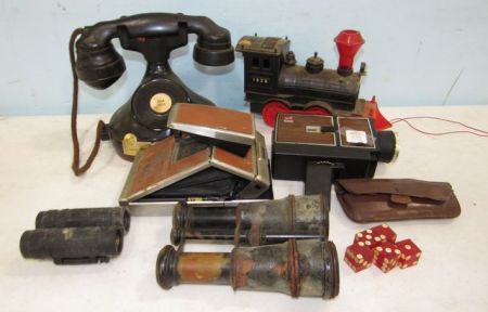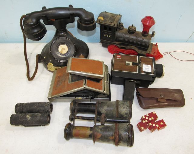 Beam whiskey phone decanter, train, Gaf s72 recorder, Polaroid SX-70 land camera, wire bifocals, dice, binoculars. Beam whiskey phone decanter, train, Gaf s72 recorder, Polaroid SX-70 land camera, wire bifocals, dice, binoculars.
