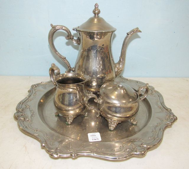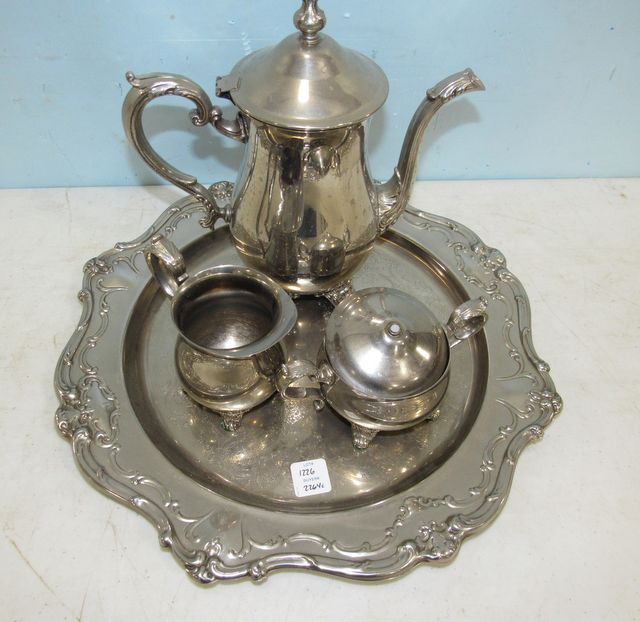 Coffer pitcher 10"h., creamer, sugar (top ornament is off), round tray 15"dia. Coffer pitcher 10"h., creamer, sugar (top ornament is off), round tray 15"dia.