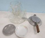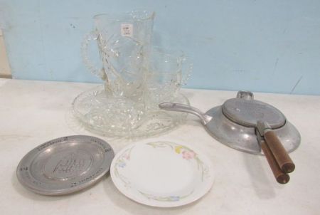 Press glass pitcher 8 1/2"h., tray, Weldwood Centennial 2, French Garden porcelain plate, Scandinavian Krumkake Iron. Press glass pitcher 8 1/2"h., tray, Weldwood Centennial 2, French Garden porcelain plate, Scandinavian Krumkake Iron.