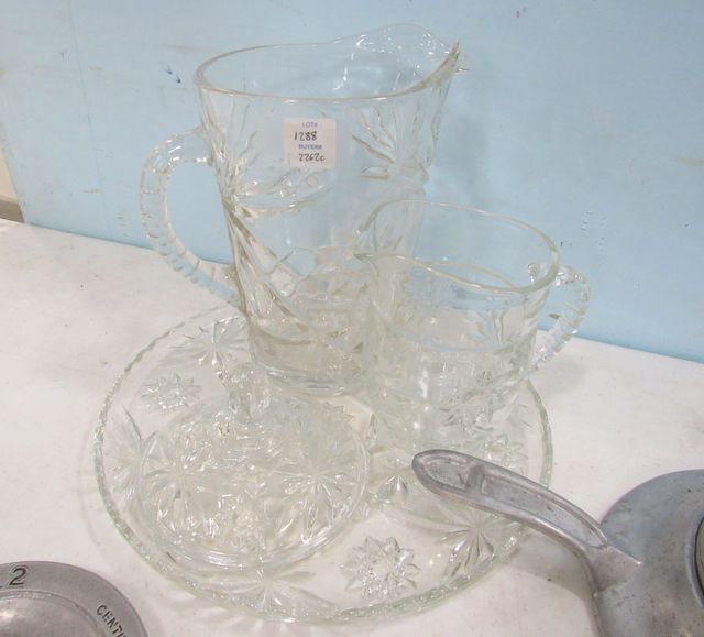 1288 Press Glass Pitcher, Tray, Small Pitcher, Krumkake Iron