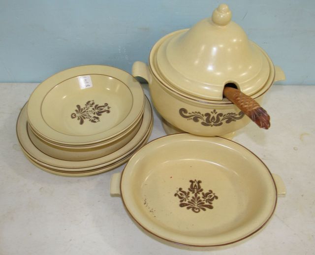 Tureen with wood ladle, handled platter, two dinner plates, two bowls. Tureen with wood ladle, handled platter, two dinner plates, two bowls.