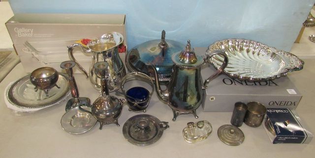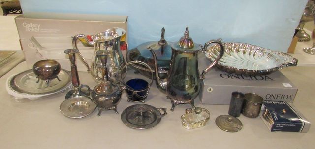Silver plate shell dish, Oneida Georgian Scroll Chip and Dip Server, coffee pitcher, covered footed dish, WM A. Rogers Gallery Baker, Leonard water pitcher, creamer, candle holder, salt & pepper, cups. Silver plate shell dish, Oneida Georgian Scroll Chip and Dip Server, coffee pitcher, covered footed dish, WM A. Rogers Gallery Baker, Leonard water pitcher, creamer, candle holder, salt & pepper, cups.