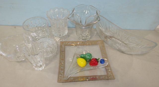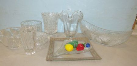 Lismore look like bowl, gold etched square plate, glass fruit, crimped vase, two pressed glass vases, heavy glass bowl, banana boat dish, etched glass candy dish. Lismore look like bowl, gold etched square plate, glass fruit, crimped vase, two pressed glass vases, heavy glass bowl, banana boat dish, etched glass candy dish.