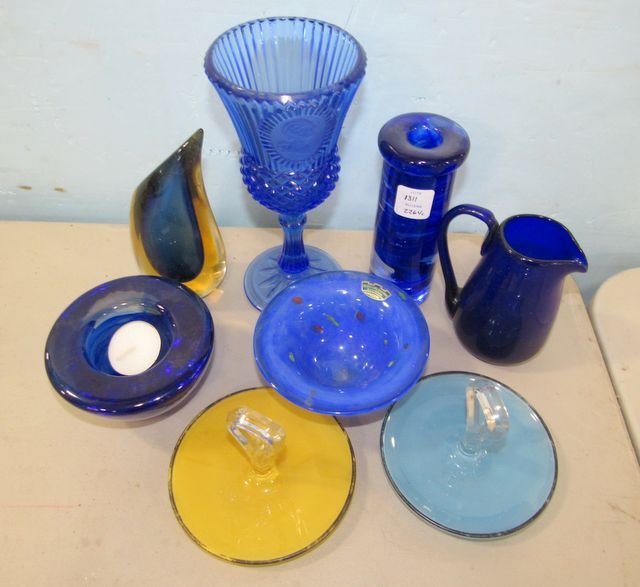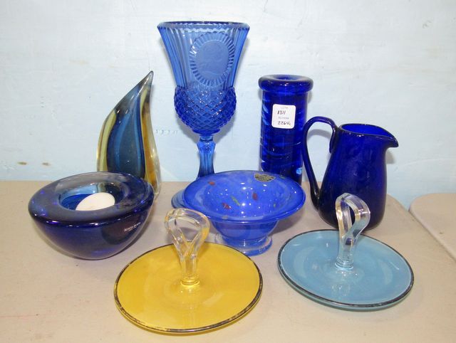 Blue glass bud vase, blue Avon portrait stem, two mini handled dishes, small blue glass pitcher 5"h., multi color glass paper weight, Stockholms Glasbruk signed blue glass bowl, Kosta Boda candle holder. Blue glass bud vase, blue Avon portrait stem, two mini handled dishes, small blue glass pitcher 5"h., multi color glass paper weight, Stockholms Glasbruk signed blue glass bowl, Kosta Boda candle holder.