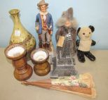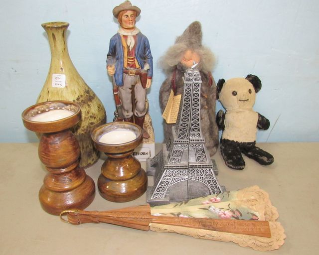 Two ceramic candle holders, signed rustic pottery vase 12"h., wood frame fan, Billy the Kid decanter, bookend Eiffel tower, Vasterbottnisk Vittra 1992 lady doll, antique panda bear. Two ceramic candle holders, signed rustic pottery vase 12"h., wood frame fan, Billy the Kid decanter, bookend Eiffel tower, Vasterbottnisk Vittra 1992 lady doll, antique panda bear.