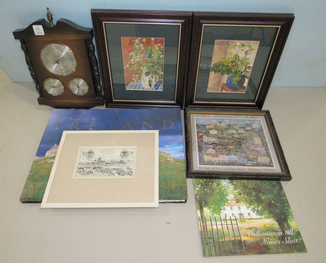 Jason barometer, two floral prints by Summerberg 12"h., 10"w., KVARTERET LOTSEN AR 1995 print 10"h., 11"w., Ireland book, Valkommen Till Noors Slott, Praga print 9"h., 11"w. Jason barometer, two floral prints by Summerberg 12"h., 10"w., KVARTERET LOTSEN AR 1995 print 10"h., 11"w., Ireland book, Valkommen Till Noors Slott, Praga print 9"h., 11"w.