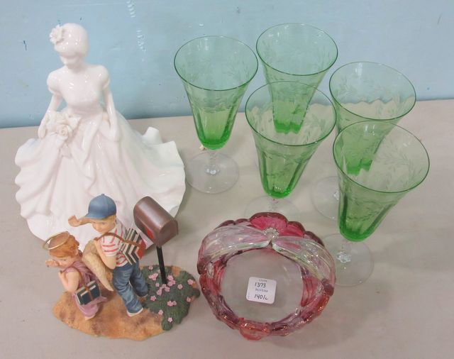 1373 Paris Royal Porcelain Figurine, Art Glass Basket, Momma I'll Be Fine Figurine, Five Etched Glasses