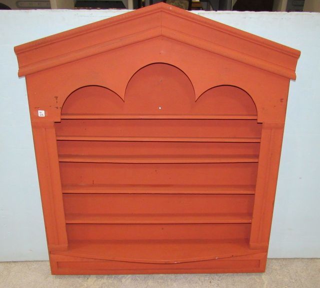 Six small display shelves, wood, has border trim, 50"h., 44"w. Six small display shelves, wood, has border trim, 50"h., 44"w.