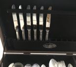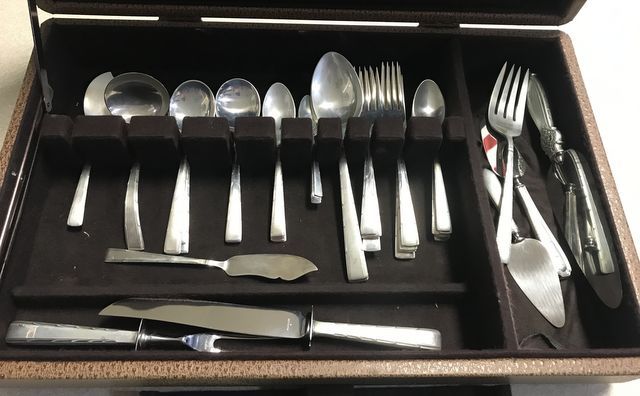 Eastering Sterling "Horizon" Flatware Set, 1944, 12 teaspoons, 12 forks, 7 soup spoons, 3 serving spoons, small ladle, cream spoon, serving fork, 6 demi tasse, 6 knives (not included in weight),, carving set and 3 pie knife (not included in weight), butter knifes (not included in weight), in box, 49.045 ozt. Eastering Sterling "Horizon" Flatware Set, 1944, 12 teaspoons, 12 forks, 7 soup spoons, 3 serving spoons, small ladle, cream spoon, serving fork, 6 demi tasse, 6 knives (not included in weight),, carving set and 3 pie knife (not included in weight), butter knifes (not included in weight), in box, 49.045 ozt.
