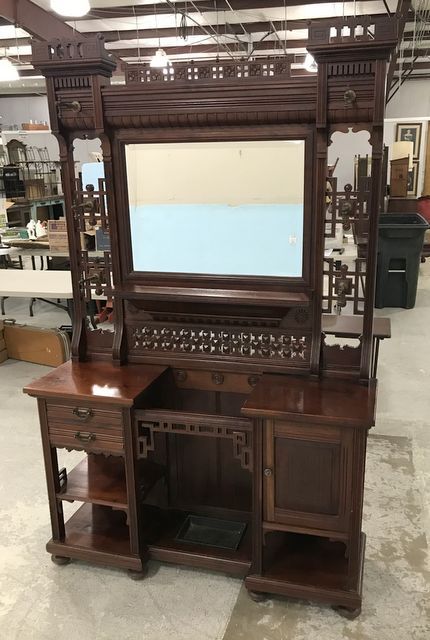 Antique Victorian Hall Tree Stand, single door, two drawers, beveled mirror, display shelf, 6 brass hooks, umbrella holder with metal insert, carved trim work, above average condition, has had some minor repairs, 80"h., 51"w., 15"d. Antique Victorian Hall Tree Stand, single door, two drawers, beveled mirror, display shelf, 6 brass hooks, umbrella holder with metal insert, carved trim work, above average condition, has had some minor repairs, 80"h., 51"w., 15"d.