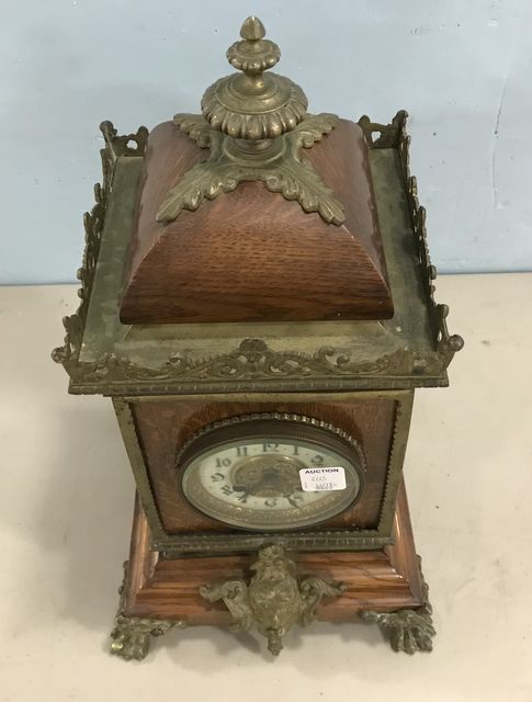 Antique French Oak Mantle Clock, brass ormolu, face portrait, claw footed, has key, pendulum, does work, good condition, 17"h., 8"w. Antique French Oak Mantle Clock, brass ormolu, face portrait, claw footed, has key, pendulum, does work, good condition, 17"h., 8"w.