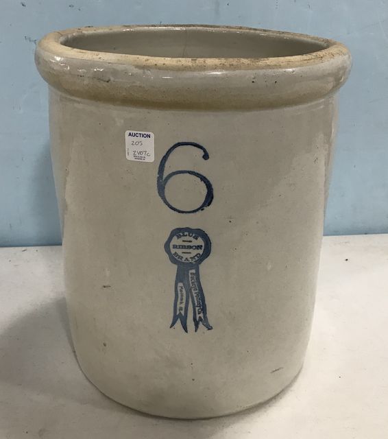 Vintage 6 Gallon Blue Ribbon Brand Stoneware Crock, has some hair line cracks, Buckeye Pottery Co., 15"h., 12"dia. Vintage 6 Gallon Blue Ribbon Brand Stoneware Crock, has some hair line cracks, Buckeye Pottery Co., 15"h., 12"dia.