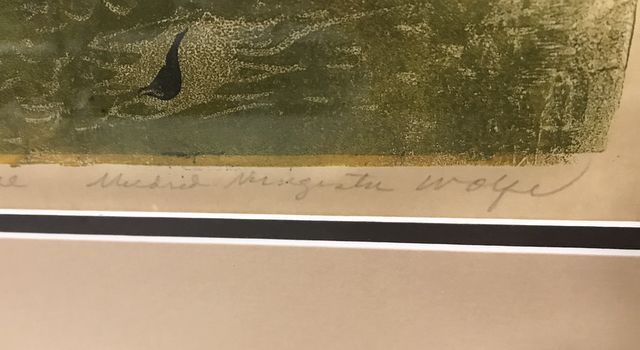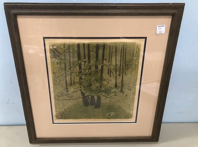 Framed Lino cut "Gum in Fall" by Mildred Wolfe, signed in pencil, matted, frame is 21"h., 21"w. Framed Lino cut "Gum in Fall" by Mildred Wolfe, signed in pencil, matted, frame is 21"h., 21"w.