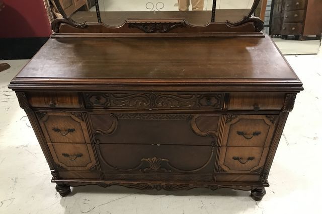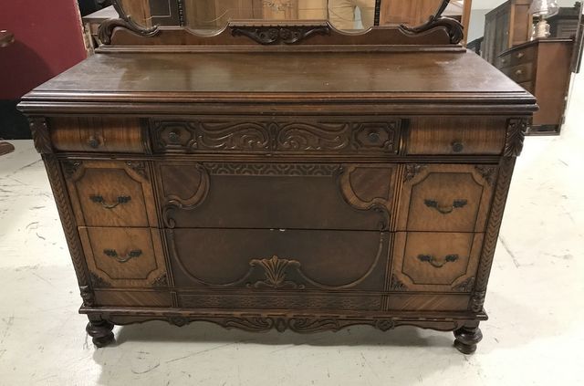 Vintage depression era dresser, walnut, ornate carving trim, 9 drawers, three mirror panel etched floral, beveled, has wear on finish, 72"h., 51"w., 20"d. Vintage depression era dresser, walnut, ornate carving trim, 9 drawers, three mirror panel etched floral, beveled, has wear on finish, 72"h., 51"w., 20"d.