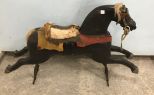 Antique Wood Carousel Riding Horse, painted black, has leather saddle with age wear, metal base has been added, 30"h., 43"w. Antique Wood Carousel Riding Horse, painted black, has leather saddle with age wear, metal base has been added, 30"h., 43"w.
