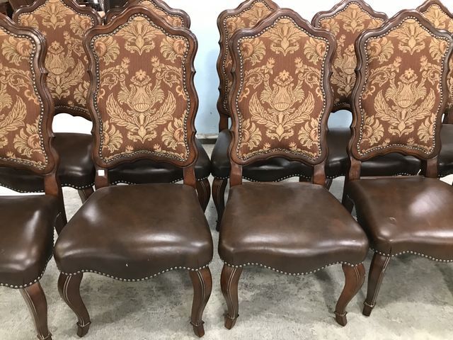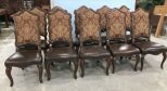10 Schnadig French Style High Back Chairs, cherry, reproduction, vinyl seats, upholstered backs, above average condition, 45"h. 10 Schnadig French Style High Back Chairs, cherry, reproduction, vinyl seats, upholstered backs, above average condition, 45"h.