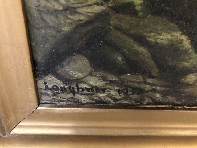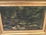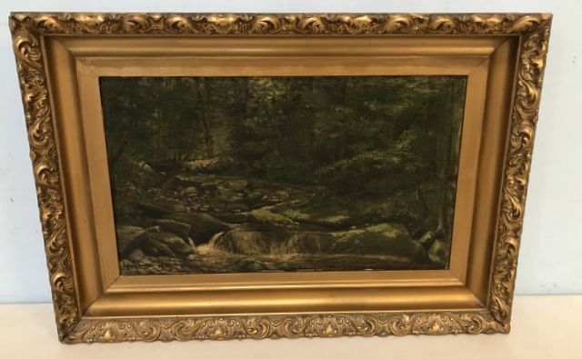 Antique oil paintings of creek and woods, signed lower left Louqbrier 1917, gold gilt ornate framed, 26"w., 18"h. Antique oil paintings of creek and woods, signed lower left Louqbrier 1917, gold gilt ornate framed, 26"w., 18"h.