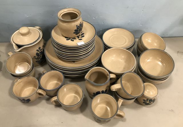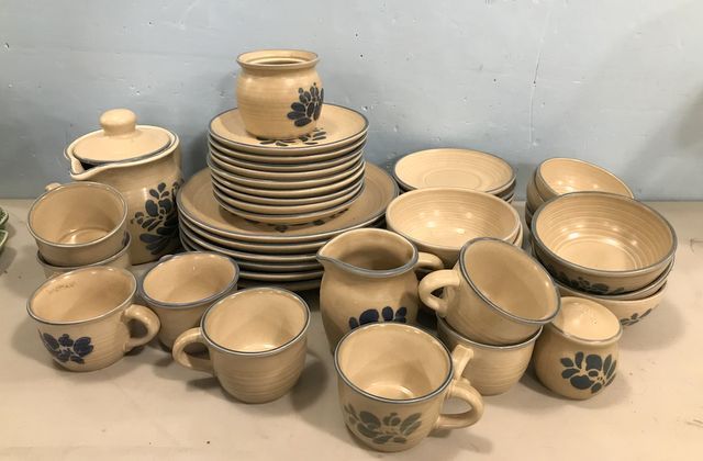 Pfalzgraff Stoneware "Folk Art" Set, 6 dinners plates, 8 cups, 9 salads, 8 saucers, salt peppers, creamer, pitcher, salad bowls, sugar. Pfalzgraff Stoneware "Folk Art" Set, 6 dinners plates, 8 cups, 9 salads, 8 saucers, salt peppers, creamer, pitcher, salad bowls, sugar.