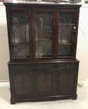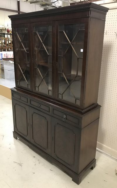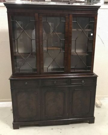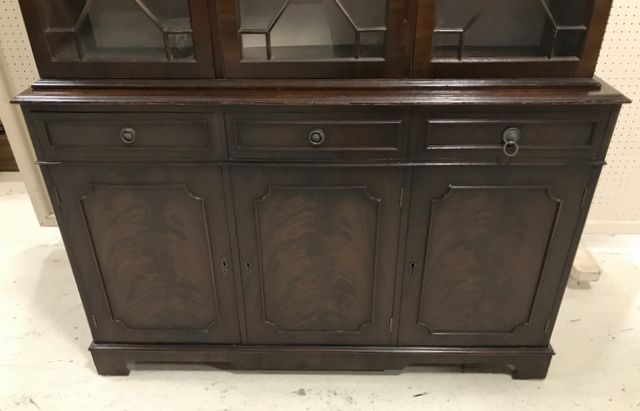 Chippendale Style Break Front China Cabinet, medium sized, two piece, triple glass door, wood shelves, three flatware drawers, three bottom doors, has some finish wear, 75"h., 54"w., 15"d. Chippendale Style Break Front China Cabinet, medium sized, two piece, triple glass door, wood shelves, three flatware drawers, three bottom doors, has some finish wear, 75"h., 54"w., 15"d.