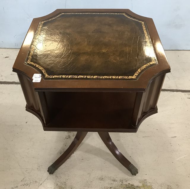 Vintage Duncan Phyfe Lamp Table, with leather top lining, two tier, brass claw feet, 28"h., 22"w. Vintage Duncan Phyfe Lamp Table, with leather top lining, two tier, brass claw feet, 28"h., 22"w.