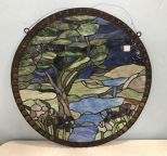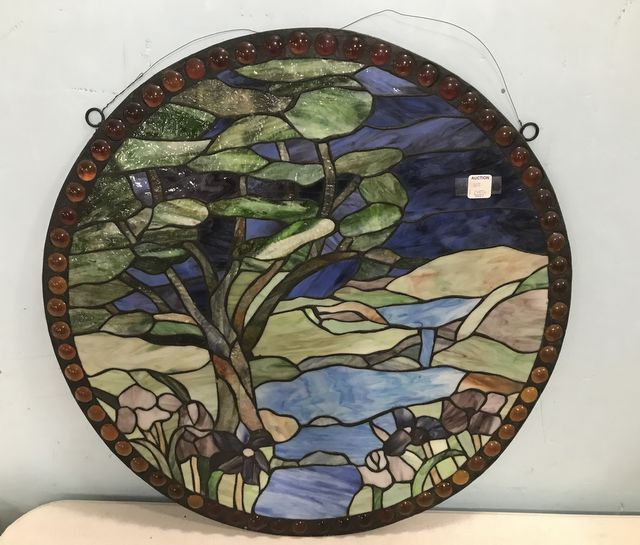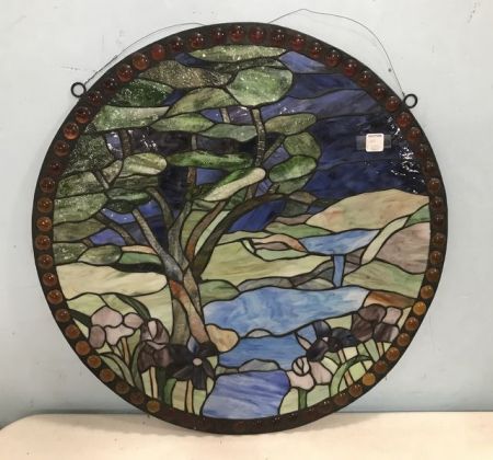 Round Stained Slag Glass Window Panel, landscape design, colorful, decorative border, no cracks, 24"dia. Round Stained Slag Glass Window Panel, landscape design, colorful, decorative border, no cracks, 24"dia.