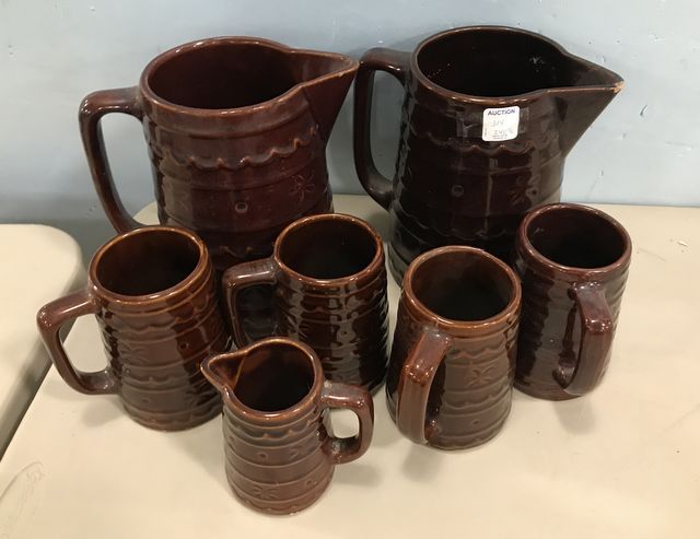 Mar Crest Stoneware Pottery, glazed stoneware pitchers 8"h., (has some chips), creamer, four mugs. Mar Crest Stoneware Pottery, glazed stoneware pitchers 8"h., (has some chips), creamer, four mugs.