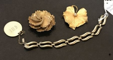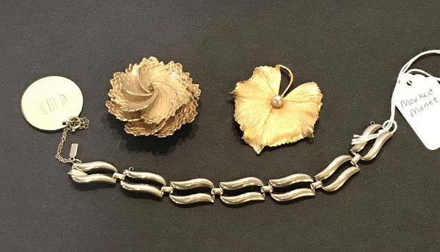 Two marked coro pins (one missing stick), marked Monet bracelet with monogrammed pendant. Two marked coro pins (one missing stick), marked Monet bracelet with monogrammed pendant.