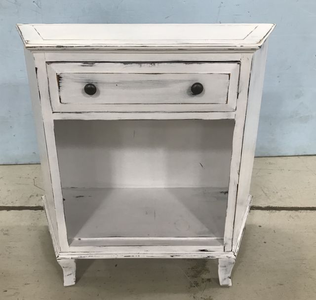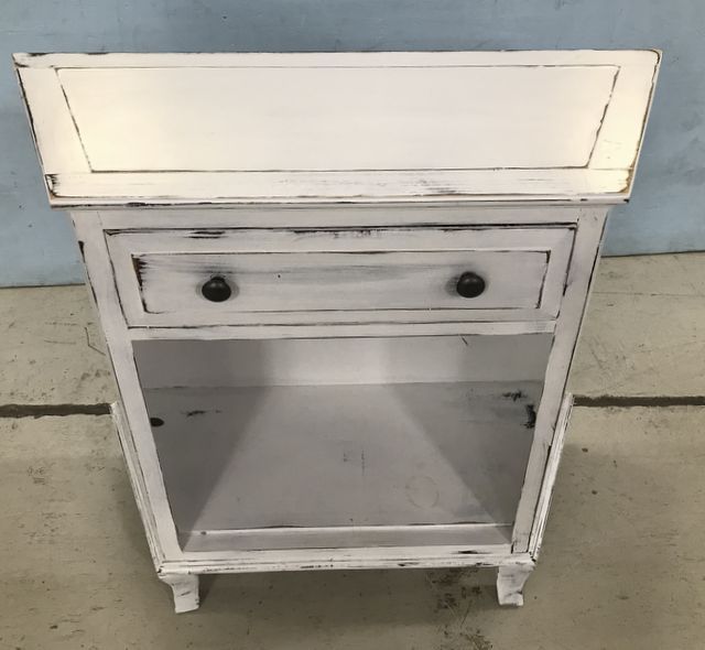 White painted wall commode, single drawer, open front storage, distressed, 35"h., 34"w., 14"d. White painted wall commode, single drawer, open front storage, distressed, 35"h., 34"w., 14"d.