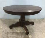 Vintage oak pedestal round top dinning table, no leaves, dark stain, has some scratches, 28"h., 48"dia. Vintage oak pedestal round top dinning table, no leaves, dark stain, has some scratches, 28"h., 48"dia.