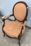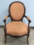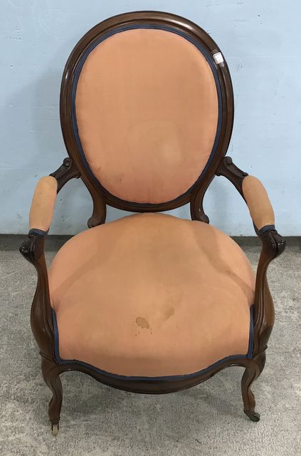 Vintage French Style Arm Parlor Chair, mahogany frame, front wheels, has stains in fabric, 38"h. Vintage French Style Arm Parlor Chair, mahogany frame, front wheels, has stains in fabric, 38"h.