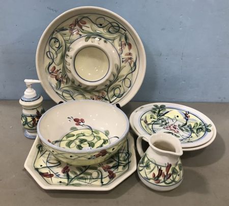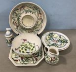 Group of Hand Painted Gail Pittman Pottery, dip tray, square dish, soap dispenser, creamer, three bowls. Group of Hand Painted Gail Pittman Pottery, dip tray, square dish, soap dispenser, creamer, three bowls.