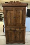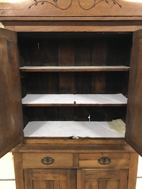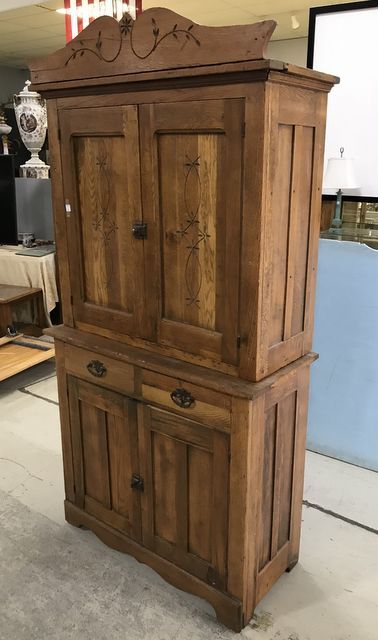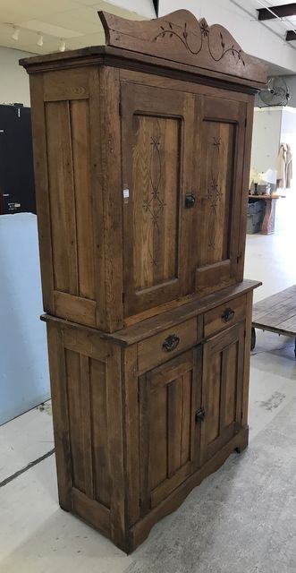 Vintage oak two piece cabinets, double doors, shelves, carved designs, above average condition, two drawers, 81"h., 40"w., 18"d. Vintage oak two piece cabinets, double doors, shelves, carved designs, above average condition, two drawers, 81"h., 40"w., 18"d.
