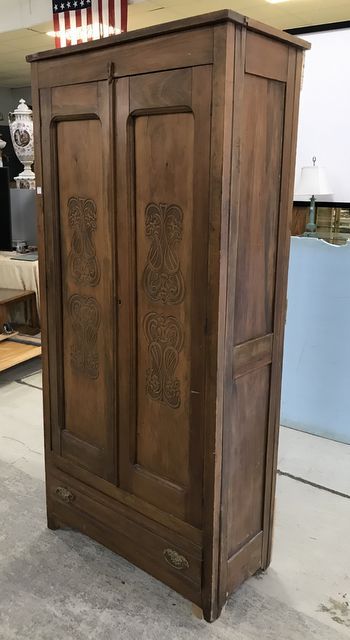 Vintage oak wardrobe, double door, carved designs, single drawer, shelve with hanging hooks, needs work, 79"h., 37"w., 19"d. Vintage oak wardrobe, double door, carved designs, single drawer, shelve with hanging hooks, needs work, 79"h., 37"w., 19"d.