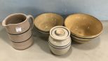 Four Blue Label Stoneware Pottery, two bowls, sugar, pitcher 8"h. Four Blue Label Stoneware Pottery, two bowls, sugar, pitcher 8"h.