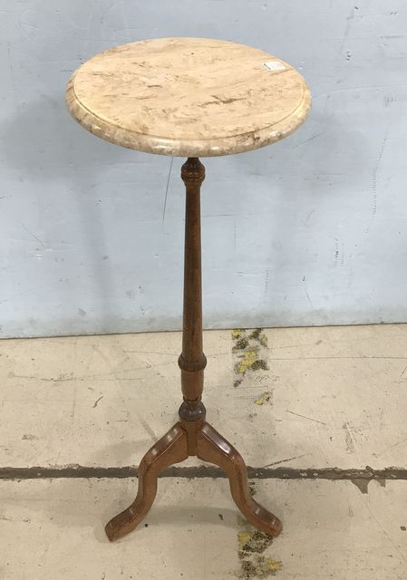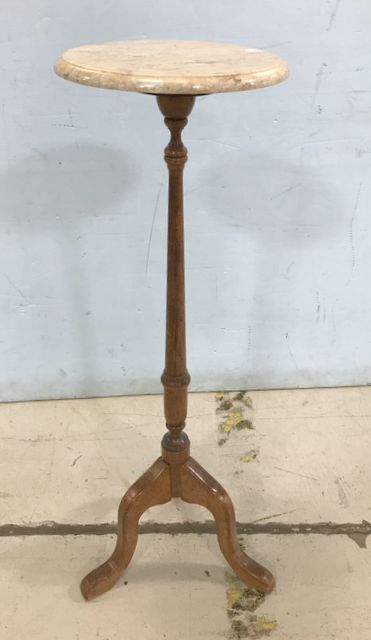 Vintage 1980's Pedestal Plant Stand, round marble top, speckled wood finish, three leg, 37"h., 38"dia. Vintage 1980's Pedestal Plant Stand, round marble top, speckled wood finish, three leg, 37"h., 38"dia.