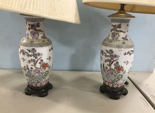 Pair of Oriental Porcelain Vase Table Lamps, floral and bird painted, wood base stands, brass top caps, shades, 31"h. Pair of Oriental Porcelain Vase Table Lamps, floral and bird painted, wood base stands, brass top caps, shades, 31"h.