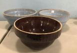 389 Pair of Blue Stoneware Pottery Bowls and Brown Glaze Stoneware Bowl