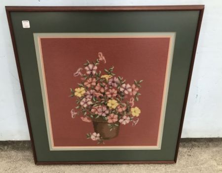 Framed Needle Point Still Life Flowers, matted, framed, 30"h., 28"w. Framed Needle Point Still Life Flowers, matted, framed, 30"h., 28"w.