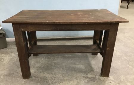 Antique Primitive Style Library Table, natural finish, two tier, oak finish, 30"h., 51"w., 27"d. Antique Primitive Style Library Table, natural finish, two tier, oak finish, 30"h., 51"w., 27"d.