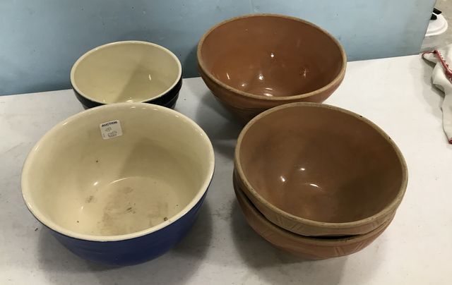 Five Stoneware pottery mixing bowls, three bowls, blue bowls. Five Stoneware pottery mixing bowls, three bowls, blue bowls.