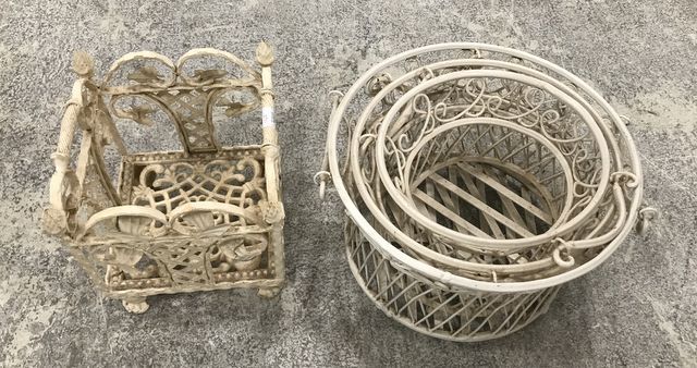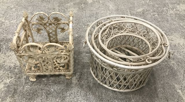 Four white painted iron planters, decor, assorted sized metal baskets, and footed white painted metal planter, 9"h., 9"w. Four white painted iron planters, decor, assorted sized metal baskets, and footed white painted metal planter, 9"h., 9"w.