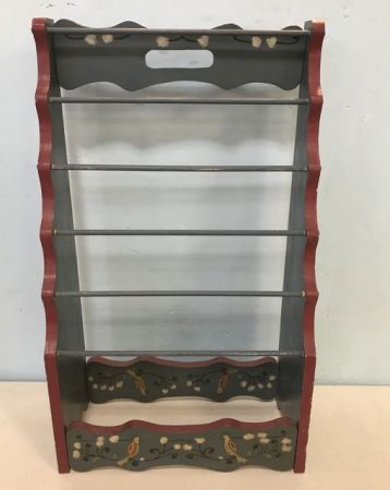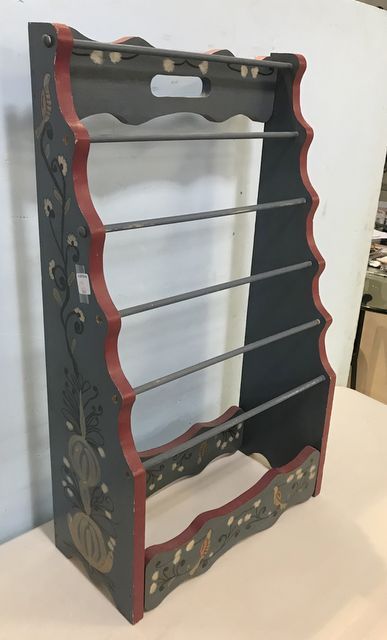 Painted wood linen rack, birds and floral designs, handled, linen hanging rods, 30"h., 17"w. Painted wood linen rack, birds and floral designs, handled, linen hanging rods, 30"h., 17"w.