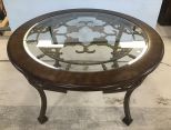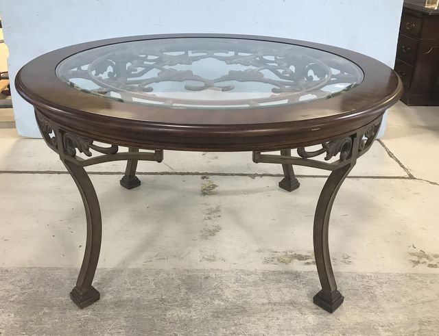 Large Modern Cherry Round Dinning Table, beveled glass top with metal decor frame and legs, good condition, 30"h., 54"dia. Large Modern Cherry Round Dinning Table, beveled glass top with metal decor frame and legs, good condition, 30"h., 54"dia.