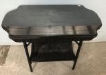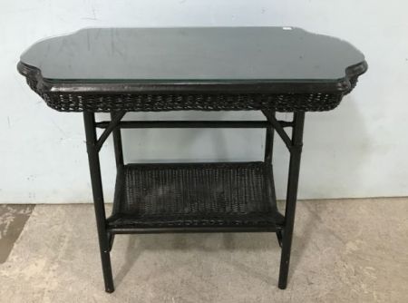 Painted Wicker Accent Table with Book Rack, two tier, turtle top shape with glass top, good condition, 28"h., 36"w., 19"d. Painted Wicker Accent Table with Book Rack, two tier, turtle top shape with glass top, good condition, 28"h., 36"w., 19"d.
